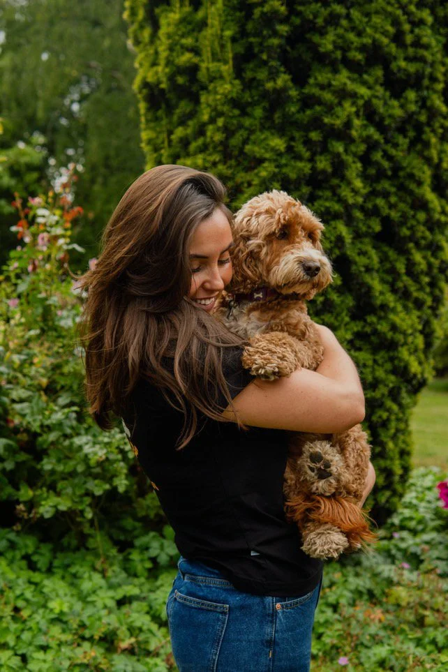 A woman with long brown hair smiling while holding a fluffy, apricot-colored dog outdoors in a lush green garden.